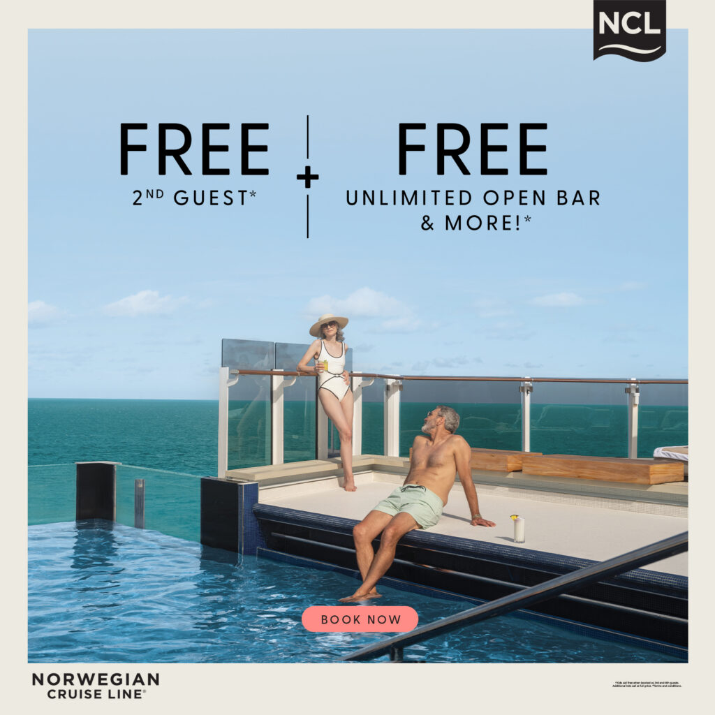 Norwegian Cruise Lines Free Second Guest Plus Free at Sea – Unlimited Open Bar & More For a limited time, second guests sail FREE on Norwegian Cruise Lines. Plus, their signature Free at Sea: Unlimited Open Bar Complimentary Specialty Dining Free Wifi $50 Excursion Credit per Port Get Started *Offer valid 4/1/2026 – 4/6/2026